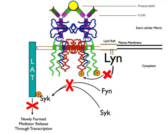 Proxicromil acts as an inhibitor of this process, competing with IgE antibodies for binding with the FcεRI receptors, thereby reducing the irritation caused by histamines. The substance was found to reduce allergic reactions and the severity of clinical diseases when administered just before the onset.