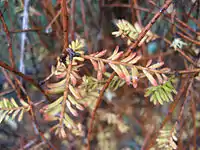Unlike the related miro (Prumnopitys ferruginea), matai has a distinctive and long-lasting juvenile stage. The juvenile is a shrub with a tangle of slender, flexible, divaricating branchlets interspersed with a scattering of brown, pale yellow, or dirty white leaves. After a number of years, the adult tree begins to grow out of the top of the juvenile shrub and then the divaricating branchlets will wither and drop off.[3][4]