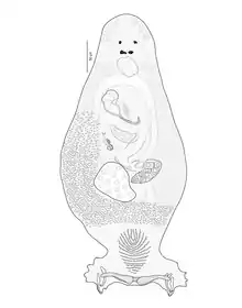 Pseudorhabdosynochus hirundineus is a small monogenean, 0.3-0.5 mm in length.[1] The species has the general characteristics of other species of Pseudorhabdosynochus, with a flat body and a posterior haptor, which is the organ by which the monogenean attaches itself to the gill of is host. The haptor bears two squamodiscs, one ventral and one dorsal. The sclerotized male copulatory organ, or "quadriloculate organ", has the shape of a bean with four internal chambers, as in other species of Pseudorhabdosynochus.[2] The vagina includes a sclerotized part, which is a complex structure.