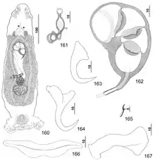 The sclerotized male copulatory organ, or "quadriloculate organ", has the shape of a bean with four internal chambers, as in other species of Pseudorhabdosynochus.[2]