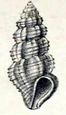 (Original description) A very attenuate, fusiform, solid species. It is eight-whorled, inclusive of the two glassy shining apical, longitudinally strongly ribbed. The shell contains few ribs, seven on the body whorl, crossed spirally with few intersecting lirae, and between these run many fine striations. The aperture is ovate. The outer lip is thickened. The sinus is very obscure. The columella is straight. The siphonal canal is short.[2]