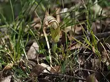 Pterostylis truncata, commonly known as the brittle greenhood or little dumpies,[2] is a species of orchid endemic to eastern Australia. It is easily distinguished from other greenhood orchids by its short habit and relatively large, "dumpy", green, white and brown flowers. It is widespread and common in New South Wales and the Australian Capital Territory but is classed as "endangered" in Victoria due to habitat loss as a result of urbanisation.
