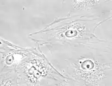 PtK2 cells are relatively large, and when grown in a monolayer, stay flat throughout the cell cycle - unlike many cells that round up during mitosis.[5] PtK2 cells are resistant to adenovirus 5, coxsackievirus B5, and poliovirus 2. They are susceptible to coxsackievirus A9, herpes simplex, vaccinia, and vesicular stomatitis (Ogden strain).[6] PtK2 cells contain intermediate filaments composed of Keratin.[7]