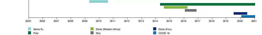 Since 2009, there have been six PHEIC declarations:[6][7] the 2009 H1N1 (or swine flu) pandemic, the 2014 polio declaration, the 2014 outbreak of Ebola in Western Africa, the 2015–16 Zika virus epidemic,[8] the 2018–20 Kivu Ebola epidemic,[9] and the ongoing COVID-19 pandemic.[10] The recommendations are temporary and require reviews every three months.[1]