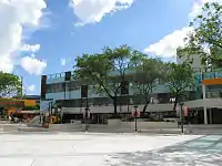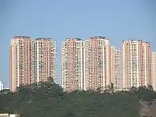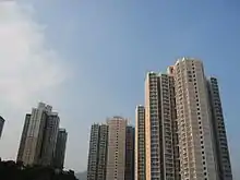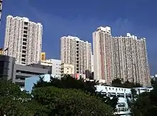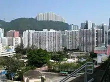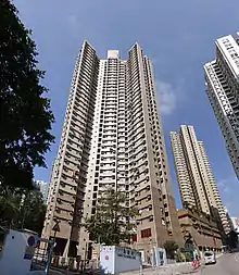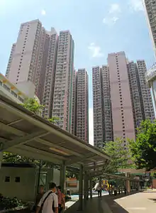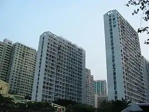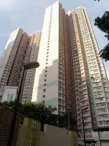 Kwai Hing Estate (Chinese: 葵興邨) was built in the valley of Gin Drinkers Bay,[24] later the town centre of Kwai Chung. Kwai Hing station is named after the name of the estate. It comprises 4 buildings with a total of 400 rental units (TPS units excluded) and 1 shopping arcade. Before redevelopment, it consisted of 5 buildings which were completed between 1970 and 1972. In 1985, the HKHA announced that the strength of the concrete in blocks 3, 4 and 5 of Kwai Hing Estate were below standard.[25] All the blocks were later demolished between 1988 and 1992 to cope with the estate redevelopment.[22] The estate was later redeveloped with 5 buildings between 1991 and 1992.