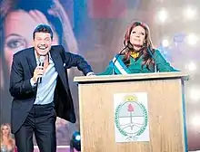 By 2012, her approval ratings once again suffered a dip, this time to around 40%, while anti-government protests attracted 250,000–500,000 demonstrators in Buenos Aires in November that year.[28] In the 2013 mid-term elections, the president's Justicialist Party suffered setbacks, dropping from 54% to 33% of the vote.[29] However, partly due to the staggered electoral system in Argentina, the government retained its majority in both houses of congress. As she was barred from running for a third term in 2015 due to term limits, her handpicked successor, Daniel Scioli, contested the 2015 Argentine general election on the Justicialist ticket.[30] However, after 12 years of Kirchnerite rule, Scioli was narrowly defeated by the center-right Cambiemos candidate, Mauricio Macri.[31] By the end of her eight-year reign, she enjoyed approval ratings above 50%.[32] According to some polls, however, her disapproval was only marginally lower than that, reinforcing Kirchner's image as a divisive leader.[33] As of July 2016, no longer being president, she became the politician with the highest disapproval ratings, alongside other members of her former cabinet. This was caused by the advances in the investigations of a big number of cases of political corruption that took place during her presidency, and her lack of activity.[34]