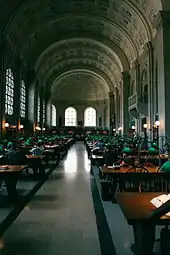 The first free public library supported by taxation in the world was the Peterborough, New Hampshire Town Library which was founded at town meeting on April 9, 1833.[12] Many sources claim to have been the first, such as Boston's Public Library, which was the second, established in 1852. The Boston Public Library opened on March 20, 1854.[13] The first free continuous children's library in the United States was funded privately, founded in 1835 in Arlington, Massachusetts.[14]