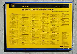 Some timetables, particularly at railway stations and bus stops, list the times that services depart from that location, sometimes with other information such as destinations and stopping conditions. Again, there may be separate lists for different days of the week. There may be a separate list for each line/direction, or a combined chronological list (as in the picture). In parts of mainland Europe train departures are listed on a yellow poster, and arrivals on a white poster. These posters are placed at entrances to stations and on platforms.
