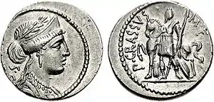 Common among the surviving coins issued by Publius Crassus is a denarius depicting a bust of Venus, perhaps a reference to Caesar's legendary genealogy, and on the reverse an unidentified female figure standing by a horse. The short-skirted equestrian holds the horse's bridle in her right hand, with a spear in her left. A cuirass and shield appear in the background at her feet. She may be an allegorical representation of Gallia, to commemorate Crassus's military achievements in Gaul and to honor the thousand Gallic cavalry who were deployed with him for Syria.[86]