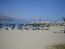 According to the Municipality of Marbella, Puerto Banús is visited annually by nearly 5 million people.[5] Visitors to the port tend to be mostly tourists from northern Europe (especially United Kingdom) and Arabs (especially Kuwait and Saudi Arabia), along with Spanish tourists. The focal point of Puerto Banús is the marina. It has berths for 915 boats, including those of the King of Saudi Arabia and several of the world's wealthiest individuals. Behind the harbour lie streets filled with bars, boutiques and nightclubs. The marina has slips for boats and ships from 8–50 metres (26–164 ft).[2] Its surface area is 15 hectares (37 acres), and its depth ranges from 3–6 metres (9.8–19.7 ft) within the marina, with 7.5 metres (25 ft) at its entrance. There is a beach on each side of the marina where boats can be hired.