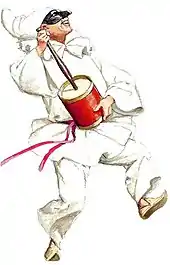 Pulcinella is most often portrayed in a baggy, white ensemble consisting of a long-sleeved, loose-fitting blouse with buttons down the front. He paired this with wide-legged trousers, the whole outfit complemented by a belt of sorts that cinches below the belly. This gives him a place to hold props while emphasizing his pot belly.[14] A hat is always worn, though the style can vary. Typically, it can either be a skull cap, or hat with turn-up brim,[16] a soft conical hat whose point lays down, or a rigid sugar-loaf hat. The sugar loaf hat gained popularity in the late 17th and early 18th centuries. Either hat is white.[17]