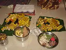 Food prepared on this occasion is special and consist of rice, sambhar, rasam, chutney, two or three types of vegetable dishes, payasam, laddo, curd and pappad and many more items.[3]