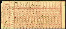 At the end of the 1800s Herman Hollerith invented the recording of data on a medium that could then be read by a machine,[13][14][15][16] developing punched card data processing technology for the 1890 U.S. census.[17] His tabulating machines read and summarized data stored on punched cards and they began use for government and commercial data processing.