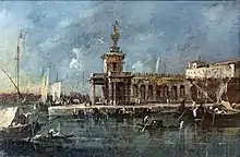 The museum's art is housed in and around the Dogana da Mar building. It was built between 1678 and 1682 as a customs house.[2] by Giuseppe Benoni. The arcade styles reflect their construction in different eras.[3] Atop the building are two statues of Atlas holding a golden globe upon which 's Fortune stands. The 17th-century statue turns in the wind.[3] The group was built by Bernardo Falconi[4] to represent the supremacy of the Republic of Venice.[2] The last renovation of the building was done by Alvise Pigazzi in 1838.[3]
