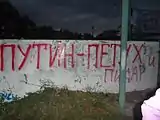 "Putin – khuylo!" (Ukrainian: Пу́тін — хуйло́, IPA: [ˈput⁽ʲ⁾in xʊjˈlɔ]; Russian: Пу́тин — хуйло́, IPA: [ˈputʲɪn xʊjˈlo]; commonly translated as "Putin is a dickhead")[1] is a Ukrainian- and Russian-language slogan deriding Russian President Vladimir Putin. It originated in Ukraine in 2014 having grown from a football chant first performed by FC Metalist Kharkiv ultras and Shaktar Donetsk ultras in March 2014 on the onset of the Russian annexation of Crimea and military intervention in Ukraine. The phrase has become very widespread throughout Ukraine among supporters of the Ukrainian government and, more generally, those who do not like Vladimir Putin in both Russian-speaking and Ukrainian-speaking areas of Ukraine.