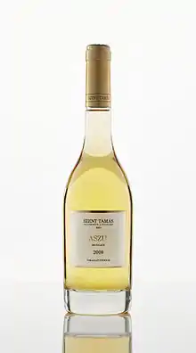 Puttonyos is a unit for the level of sugar in Hungarian Tokaji (or tokay) and Slovak Tokaj dessert wine. It is traditionally measured by the number of hods of sweet botrytised or nobly rotted grapes (known as Aszú) added to a barrel of wine, but is now measured in grams of residual sugar.[1] The puttony was actually the 25 kg basket or hod of Aszú grapes, and the more added to the barrel of wine, the sweeter the eventual wine.[1] Measurement ranges from 3 to 6 Puttonyos. A Tokaji made entirely from Aszú grapes is not labeled using the Puttonyos system but is known as Eszencia.[1]