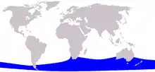The pygmy right whale is among the least studied cetaceans; until 2008, fewer than 25 sightings of the species had been made at sea.[5] The species lives in the Southern Hemisphere and is believed to be circumpolar, living in a band from about 30°S to 55°S[3] in areas with surface water temperatures between 5 and 20 °C (41 and 68 °F).[17] Individuals have been found on the coasts of Chile,[20] Tierra del Fuego, Namibia, South Africa, Australia and New Zealand. One group may be a year-round resident off Tasmania.[17] The total population is unknown.