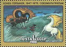 The Humpbacked Horse (Konyok-Gorbunok), sometimes known in English as The Magic Horse or The Little Magic Horse, is a version of the Golden-Maned Steed fairy-tale character type, although a large part of the plot of this story is based on Tsarevitch Ivan, the Fire Bird and the Gray Wolf. The titular little horse helps Ivan, a peasant's son, carry out the many unreasonable demands of the Tsar. During his adventures, Ivan captures the beautiful magic firebird for the tsar, keeps his magic horse, and finds his love, Tsar-Maid (Princess). At the end, the princess and the peasant's son live happily for many years after.