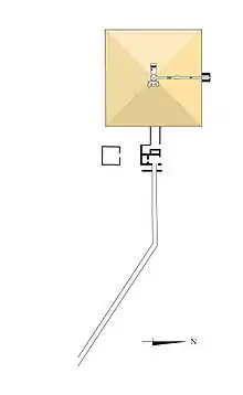 The entrance to the burial chambers is on the north face which descends to a vestibule where another shaft leads to the antechamber. To the right of the antechamber is the burial chamber; to the left is another small room, a serdab. In the burial chamber a sarcophagus decorated with polychrome reliefs stood against the wall; when found, it was in good condition although it had been plundered.[6] The ceiling of the burial chamber had an astrological theme and was covered with stars.[5]