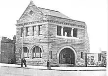 Pressure to build an official office was again placed on the Post Master General by Pyrmont residents during the 1890s, and by 1899 a site for a new office had been secured. The new office was designed by New South Wales Government Architect Walter Liberty Vernon and built by day labour at a cost of £4,347. The Minister for Public Works, Edward William O'Sullivan, officially opened it on 19 January 1901.[3] The office was built using surplus Pyrmont sandstone from the construction of the General Post Office (GPO) and Customs House buildings. The office was two storeys with a basement. The basement originally held the kitchen, dining room, laundry and bathroom, the ground floor housed the main office space and one bedroom, with three more bedrooms on the first floor.[2] It continued to function as the post office for Pyrmont for many years and remains a key part of the civic centre.[1]