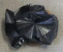 Pyrolusite is a mineral consisting essentially of manganese dioxide (MnO2) and is important as an ore of manganese.[6] It is a black, amorphous appearing mineral, often with a granular, fibrous, or columnar structure, sometimes forming reniform crusts. It has a metallic luster, a black or bluish-black streak, and readily soils the fingers. The specific gravity is about 4.8. Its name is from the Greek for fire and to wash, in reference to its use as a way to remove tints from glass.[4]