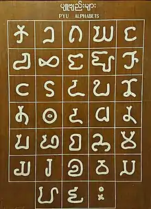 Many of the important inscriptions were written in Sanskrit and Pali, alongside the Pyu script. The Pyu sites have yielded a wide variety of Indian scripts ranging from Ashokan Brahmi script and Tamil Brahmi script, both dated to the 3rd and 2nd centuries BCE, to the Gupta script and Kannada script dated to the 4th to 6th centuries CE.[1][2]