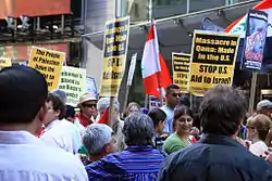Responding to the incident, Lebanese Prime Minister Fouad Siniora denounced "Israeli war criminals" and canceled talks with US Secretary of State Condoleezza Rice. In a television address to the country, he said, "There is no place on this sad morning for any discussion other than an immediate and unconditional cease-fire as well as an international investigation into the Israeli massacres."[27] After the announcement, Rice canceled her planned visit to Beirut.[8] Prime Minister Siniora appealed to the U.N. Security Council for an emergency session, which held consultations on July 30, 2006. In a statement, the Security Council expressed the world body's "extreme shock and distress" at the Qana bombing and offered its condolences for the deaths. The airstrike on Qana threatened to derail work toward a resolution in the 19-day conflict between Israel and Lebanon-based Hezbollah guerrillas.[8] In Beirut, outrage over the attack sparked violent protest at a U.N. office, with protesters using rocks, boards and poles to break into the building. In Gaza, Palestinian security forces had to eject about 2,000 demonstrators who had stormed the U.N. compound there in protest against the Qana attack.[28]