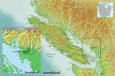 The Qayqayt First Nation (qiqéyt), also known as the New Westminster Indian Band, is a band government located at New Westminster, British Columbia. The New Westminster Indian Band - Qayqayt First Nation is recognized by all levels of government, as well as the Assembly of First Nations where they hold delegate status. The Qayqayt First Nation historically spoke the Downriver Dialect of Halkomelem called hən̓q̓əmin̓əm̓, a Coast Salish language.[1] The Qayqayt First Nation is one of the smallest First Nations in Canada and the only one registered without a land base.[2]
