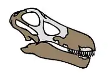 Quaesitosaurus (meaning "extraordinary lizard") is a genus of nemegtosaurid sauropod containing only the type species, Q. orientalis, described by Kurzanov and Bannikov in 1983.[1] It lived from 85 to 70 million years ago during the Late Cretaceous (Santonian to Campanian ages). Its fossils, consisting solely of a partial skull, were found in the Barun Goyot Formation near Shar Tsav, Mongolia.[1] With long, low and horse-like with frontally located peg-teeth, the skull of Quaesitosaurus is similar enough to the skull of Diplodocus and its kin to have prompted informed speculation that the missing body was formed like those of diplodocids.[2]