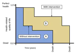 The quality-adjusted life year or quality-adjusted life-year (QALY) is a generic measure of disease burden, including both the quality and the quantity of life lived.[1][2] It is used in economic evaluation to assess the value of medical interventions.[1] One QALY equates to one year in perfect health.[2] QALY scores range from 1 (perfect health) to 0 (dead).[3] QALYs can be used to inform personal decisions, to evaluate programs, and to set priorities for future programs.[3]