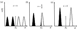 When is an integer, the Fermi energy lies in between Landau levels where there are no states available for carriers, so the conductivity becomes zero (it is considered that the magnetic field is big enough so that there is no overlap between Landau levels, otherwise there would be few electrons and the conductivity would be approximately ). Consequently, the resistivity becomes zero too (At very high magnetic fields it is proven that longitudinal conductivity and resistivity are proportional).[16]