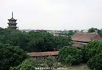 Quanzhou (also known as Zayton or Zaiton in British and American historical sources) is the atonal pinyin romanization of the city's Chinese name 泉州, using its pronunciation in the Mandarin dialect. The name derives from the city's former status as the seat of the imperial Chinese Quan ("Spring") Prefecture. Ch'üan-chou was the Wade-Giles romanization of the same name;[4][5][6] other forms include Chwanchow-foo,[7] Chwan-chau fu,[8] Chwanchew,[9] Ts'üan-chou,[10] Tswanchow-foo,[7] Tswanchau,[9] T'swan-chau fu,[8] Ts'wan-chiu,[11] Ts'wan-chow-fu,[12] Thsiouan-tchéou-fou,[8] and Thsíouan-chéou-fou.[7] The romanizations Chuan-chiu,[11] Choan-Chiu,[13] and Shanju[14] reflect the local Hokkien pronunciation.