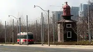 The Queen's Wharf Lighthouse (also known as the Fleet Street Lighthouse, after its current location) is a lighthouse in Toronto, Ontario, Canada. It is situated at Fleet Street just east of the Princes' Gates at Exhibition Place. The octagonal building was originally part of a pair of lighthouses built in 1861 at Queen's Wharf, replacing an earlier 16 feet lighthouse originally built in 1838.[1] The 11 metres (36 ft) three-storey wood structure is one of two lighthouses at Toronto (the other being Gibraltar Point Lighthouse).
