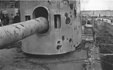 The ships' secondary battery consisted of sixteen 45-calibre BL 6-inch (152 mm) Mk XII guns.[13] The guns had a muzzle velocity of 2,825 ft/s (861 m/s) from their 100-pound (45 kg) projectiles. At their maximum elevation of 15 degrees, they had a range of 13,600 yd (12,400 m).[17] As designed twelve of these were mounted in casemates on the upper deck, six of each on the broadside of the vessel amidships; the remaining four guns were on the main deck aft abreast 'Y' turret. In an effort to ameliorate the problems that the flooding problems that the casemated guns in the Iron Duke-class ships had in heavy seas, the guns in the Queen Elizabeths were moved back from abreast 'A' turret to 'B' turret, but this made little difference in service. The aft guns were more prone to flood and were virtually useless even in moderate seas. Only Queen Elizabeth was completed with them; one pair was removed and the other was repositioned on the forecastle and protected by gun shields in May 1915. The casemates were plated over to improve their seaworthiness. The other ships were similarly modified while fitting-out.[18]