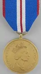 The medal was not awarded by New Zealand. However, it was accorded a place in the country's order of wear to accommodate British citizens who had received the medal in the UK and subsequently joined the New Zealand Defence Force.[9]
