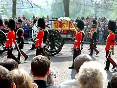 Elizabeth grew camellias in every one of her gardens, and before her flag-draped coffin was taken from Windsor to lie in state at Westminster Hall, an arrangement of camellias from her own gardens was placed on top.[139] An estimated 200,000 people over three days filed past as she lay in state in Westminster Hall at the Palace of Westminster.[140] Members of the household cavalry and other branches of the armed forces stood guard at the four corners of the catafalque. At one point, her four grandsons Prince Charles, Prince Andrew, Prince Edward and Viscount Linley mounted the guard as a mark of respect—an honour similar to the Vigil of the Princes at the lying in state of King George V.[141][142]