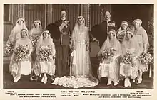 In February 1922, Elizabeth was a bridesmaid at the wedding of Albert's sister, Princess Mary, to Viscount Lascelles.[21] The following month, Albert proposed again, but she refused him once more.[22] Eventually, in January 1923, Elizabeth agreed to marry Albert, despite her misgivings about royal life.[23] Albert's freedom in choosing Elizabeth, not a member of a royal family, though the daughter of a peer, was considered a gesture in favour of political modernisation; previously, princes were expected to marry princesses from other royal families.[24] They selected a platinum engagement ring featuring a Kashmir sapphire with two diamonds adorning its sides.[25]