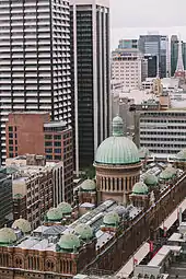 The Queen Victoria Building (abbreviated as the QVB) is a heritage-listed late-nineteenth-century building designed by the architect George McRae located at 429–481 George Street in the Sydney central business district, in the Australian state of New South Wales. The Romanesque Revival building was constructed between 1893 and 1898 and is 30 metres (98 ft) wide by 190 metres (620 ft) long. The domes were built by Ritchie Brothers, a steel and metal company that also built trains, trams and farm equipment. The building fills a city block bounded by George, Market, York and Druitt Streets. Designed as a marketplace, it was used for a variety of other purposes, underwent remodelling and suffered decay until its restoration and return to its original use in the late twentieth century. The property is owned by the City of Sydney and was added to the New South Wales State Heritage Register on 5 March 2010.[1]