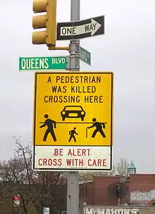 In 1985, the New York City Department of Transportation started a project to examine the causes of fatalities and injuries on the boulevard.[13] In January 1997, the city commissioned a study of the 2.5 miles (4.0 km) of roadway between the Long Island Expressway and Union Turnpike. The study was completed by 1999, and most work was finished by July 2001.[16]:138–143 As part of the improvement process, the city installed new curb- and median-extensions along the corridor; repainted crosswalks so they were more visible; added fences in the medians; closed several "slips" that allowed vehicles to make high-speed turns; posted large signs proclaiming that "A Pedestrian Was Killed Crossing Here" at intersections where fatal accidents have occurred; and reduced the speed limit from 35 to 30 miles per hour (56 to 48 km/h). Pedestrian signals were adjusted so that they were given 60 seconds to cross the boulevard, compared to 32-50 seconds before the improvements.[16]:139–146[15] A second phase covering the rest of the boulevard was studied from November 2001 to July 2004, and improvements were finished by late 2006.[16]:139–146 These improvements decreased pedestrian accidents on the boulevard by 68%, most notably at large and dangerous intersections.[16]:154 In 2004, only one pedestrian was killed crossing Queens Boulevard.[17]
