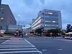 The main building, opened in 2001, is located at the southwest corner of 164th Street and 82nd Road just north of the Grand Central Parkway.[3][10] The building was designed by the Perkins and Will and Davis Brody Bond architectural firms, with a largely-glass outer facade.[11] It has 360,000 square feet (33,000 m2) of space and 200 beds.[3][10][1] It features private and semi-private patient rooms, in contrast to the large hospital wards of the previous buildings.[10] Adjacent to the south of the main building fronting the Grand Central is the only remaining pre-2000 hospital building.[3][10][12] This is the "N Building", the former Queens Hospital Center School of Nursing built in 1956.[10][13][12] It is connected to the main building by an atrium structure.[10] The nursing school graduated its final class in June 1977.[14]