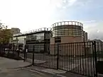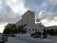 Located on the site of the current main building and nursing school were a nurses home for housing nurses, an employee's home for medical residents and hospital superintendents, and a staff building for administrative offices.[36][37][45] Along Goethals Avenue, where the Queens Gateway School and EMS station now sit, were (from east to west) the power plant, a laundry facility, a garage for ambulance storage, an industrial workshop for creating furniture and other items, and the mortuary building.[32][36][38][37][45] The morgue, which occupied the site of the school on 160th Street,[45] was a small salmon brick building,[55] and served as a municipal morgue for the entire borough.[45] This site was found to be contaminated with petroleum prior to the construction of the school.[38][56] In between Goethals Avenue and 82nd Drive, along the right-of-way of 160th Street near the current morgue, was the Queensboro Hospital which became Queens General's contagious disease division called the Queensboro Pavilion. It consisted of two buildings.[45][49] Only the power plant survives from the original 1930s campus.[33]