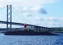 The bridge is the third crossing of the Forth at Queensferry, alongside the Forth Road Bridge, completed in 1964, and the Forth Bridge, a railway bridge completed in 1890. It is sited west of the road bridge, with the northern landfall at St Margaret's Hope, between Rosyth Dockyard and North Queensferry and the southern landfall just west of Port Edgar in South Queensferry. The central tower was constructed on the Beamer Rock, a small islet in the Forth.[50]