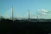 The Queensferry Crossing is a three-tower cable-stayed bridge, with an overall length of 2.7 kilometres (1.7 miles).[4] Around 4 kilometres (2.5 miles) of new connecting roads were built,[5] including new and upgraded junctions at Ferrytoll in Fife, South Queensferry and Junction 1A on the M9.