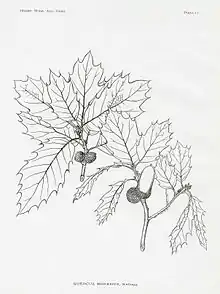 Quercus ×morehus,[1] Abram's oak in Kellogg's original description[2] (later called oracle oak by Jepson[3]), is a named hybrid between the red oaks Quercus kelloggii (California black oak) and Quercus wislizeni (interior live oak).[4] Originally published as the unique species Quercus morehus by Kellogg,[2] rather than as the hybrid it is called today,[4] this tree is found in the US states of California and possibly southern Oregon,[5] usually where the territories of the purported parents overlap.[1]