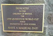 In November 2014, a plaque appeared outside the entrance of Bristol Children's Hospital attesting that the famous hooped sculptures which stand in front of the paediatric institution are, in fact, not a 50-foot-tall (15 m) interactive installation inaugurated in 2001, but instead the goalposts used in the 1998 Quidditch World Cup.[18]