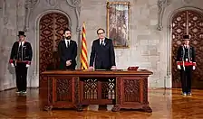 Torra contested the 2017 regional election as an independent JuntsxCat candidate in the Province of Barcelona and was elected to the Parliament of Catalonia.[21][22] At the election Catalan secessionists retained a slim majority in the Catalan Parliament.[23][24] Attempts by the secessionists to inaugurate three candidates – Carles Puigdemont, Jordi Sànchez and Jordi Turull – as President of Catalonia were thwarted by the Spanish courts.[9] In May 2018 Torra, the so-called "plan D", was nominated as candidate for president.[9][25] At the investiture vote held on 12 May 2018 Torra secured 66 votes (JuntsxCat 34; ERC–CatSí 32) with 65 votes against (Cs 36; PSC 17; CatComú–Podem 8; PP 4) and four abstentions (CUP-CC 4), failing to achieve the 68 votes necessary for an absolute majority.[26][27] As a result, a second vote was held on 14 May 2018 at which he only needed a simple majority to become president.[28][29] The result of the second vote was exactly the same as the first vote – 66 in favour, 65 against and four abstentions – and as a result Torra was elected the 131st President of Catalonia.[30][31][32] He was sworn in on 17 May 2018.[7][33] On May 19 he appointed his government, which included as regional ministers, Jordi Turull and Josep Rull (in preventive custody) as well as Toni Comín and Lluís Puig, in self-imposed exile in Belgium and also required by the Spanish justice.[34][35][36] Since article 155 was still in force, Mariano Rajoy decided not to publish the appointments in the Generalitat government gazette, which led to a criminal complaint for prevarication brought by President Torra. In order to avoid extending the application of article 155, on May 29 President Torra appointed a new government,[37] which took office on June 2, which ended a period of seven months of direct rule on Catalonia from Madrid.