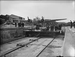 Initially, the seaplane service only operated and carried out maintenance from a specially adapted floating dock known as HMS Flat Iron. This floating dock was able to submerge and allow two seaplanes to navigate onto it and then raise itself back up to allow for complex maintenance.[10] During the 1930s the Royal Air Force improved RAF Pembroke Dock by the installation of two 'B' and one 'T' hangar and in 1938, the floating dock was towed to Invergordon as it was redundant.[10] In 1935, the first spillway was constructed which allowed aircraft to be removed from the water whatever the tide.[11] During this period, Sir Arthur Travers Harris (Bomber Harris) was the Officer Commanding RAF Pembroke Dock and 210 Squadron as a Wing Commander.[12]
