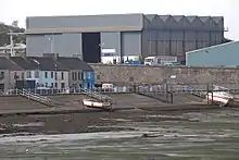 The two large 'B' type hangars have survived and are now both listed buildings.[50][51] The eastern hangar was used in 1979 to build a full-scale Millennium Falcon for use in the Star Wars film The Empire Strikes Back.[52] Other parts of the dockyard, such as the spillways have been lost in the reconstruction of the dock for the cross Irish Sea ferry to Rosslare.[53]