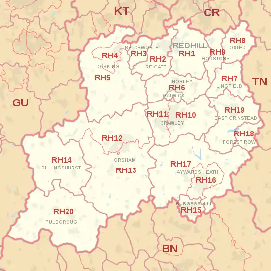 The RH postcode area, also known as the Redhill postcode area,[2] is a group of twenty postcode districts in South East England, within seventeen post towns. These cover east Surrey (including Redhill, Reigate, Betchworth, Dorking, Lingfield, Horley, Oxted and Godstone) and northeastern West Sussex (including Crawley, Gatwick, Haywards Heath, Billingshurst, East Grinstead, Burgess Hill, Horsham and Pulborough) plus small parts of northwestern East Sussex (including Forest Row).