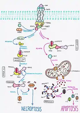 - Green DR, Oberst A, Dillon CP, Weinlich R, Salvesen GS (October 2011). "RIPK-dependent necrosis and its regulation by caspases: a mystery in five acts". Molecular Cell. 44 (1): 9–16. doi:10.1016/j.molcel.2011.09.003. PMC 3192321. PMID 21981915.